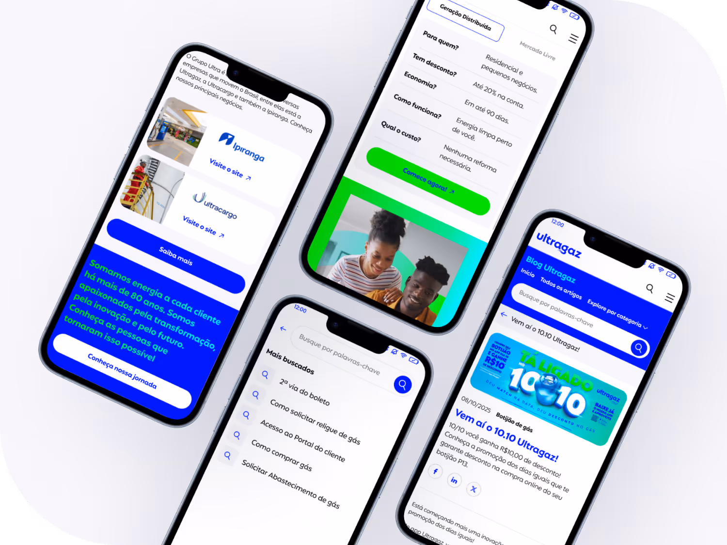 A Ultragaz, referência nacional em soluções de energia, buscava uma forma de reposicionar sua presença digital para refletir seu papel como empresa inovadora e pioneira na transição energética. O site anterior não transmitia com clareza a diversidade de negócios da companhia, nem proporcionava uma jornada fluida para seus diferentes públicos — empresarial, revendas, domiciliar e energia elétrica.